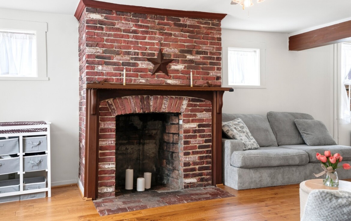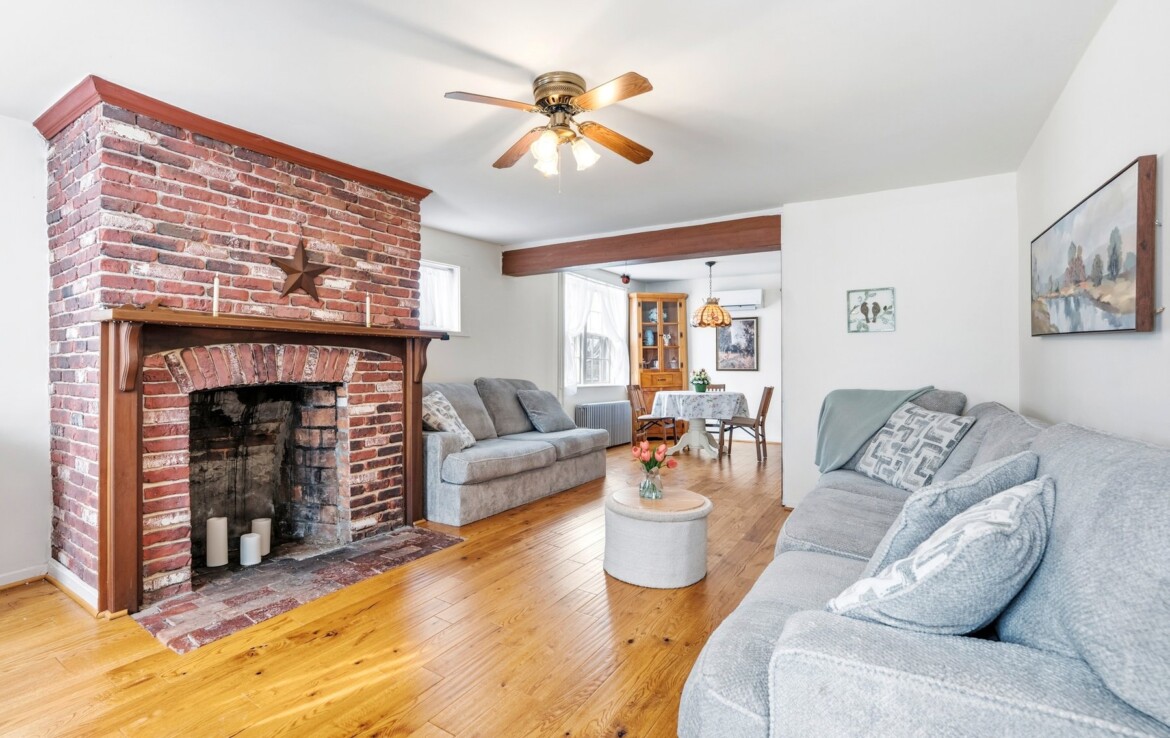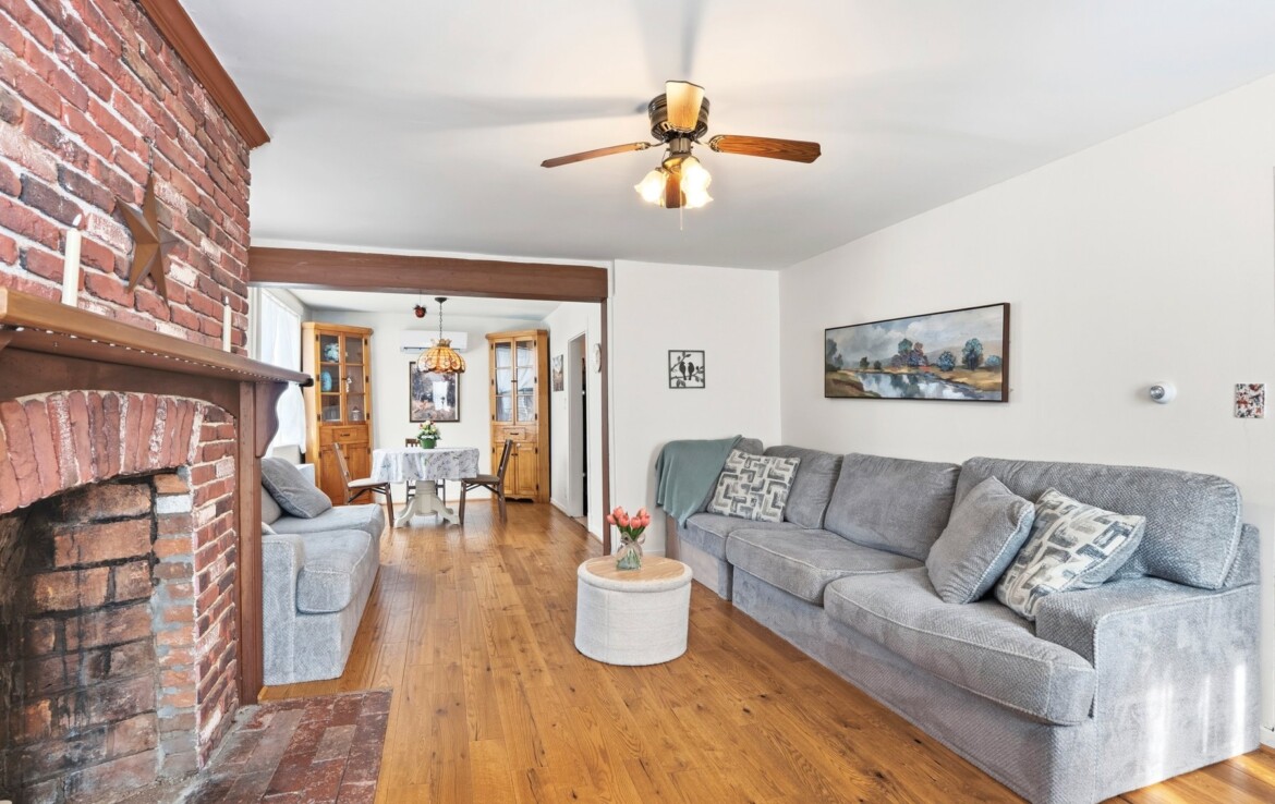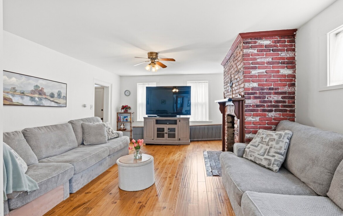 Living Room – Wood floor, ceiling fan, fireplace with wood mantel, 4 windows.