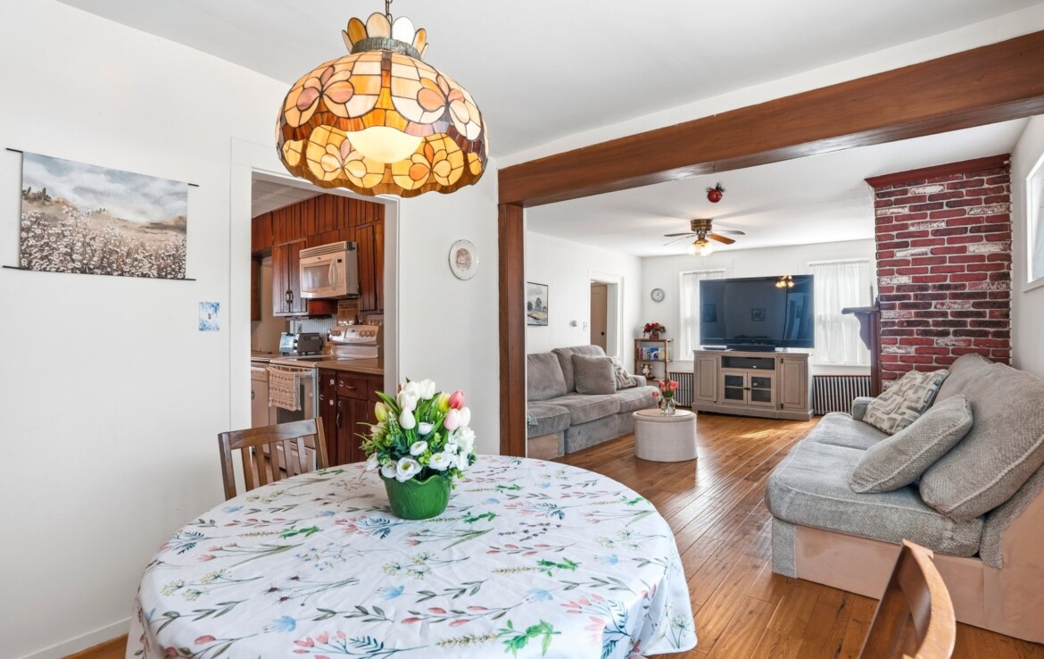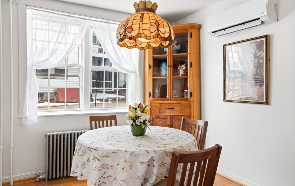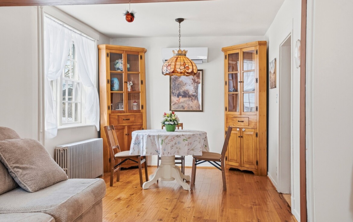 Dining Room – Wood floor, hanging lamp, FUJITSU mini split, 2 windows.