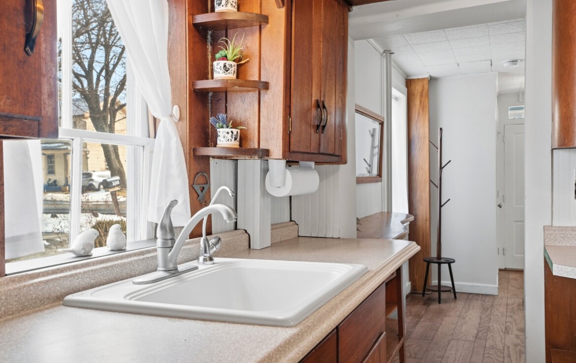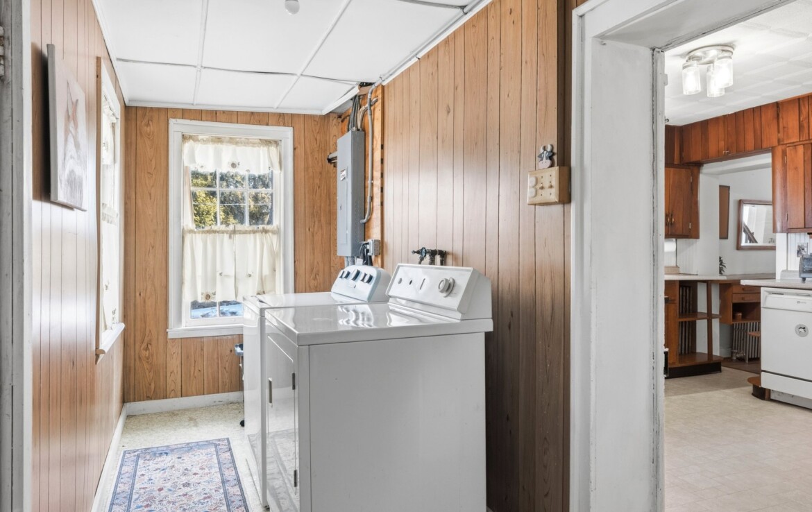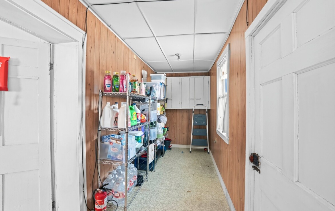 Laundry/Pantry – Vinyl floor,  door to yard, 3 windows.