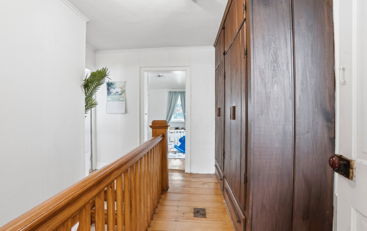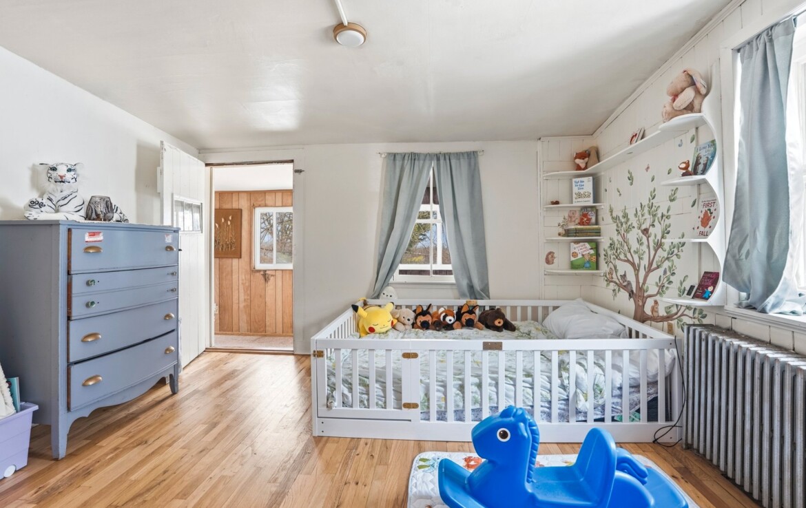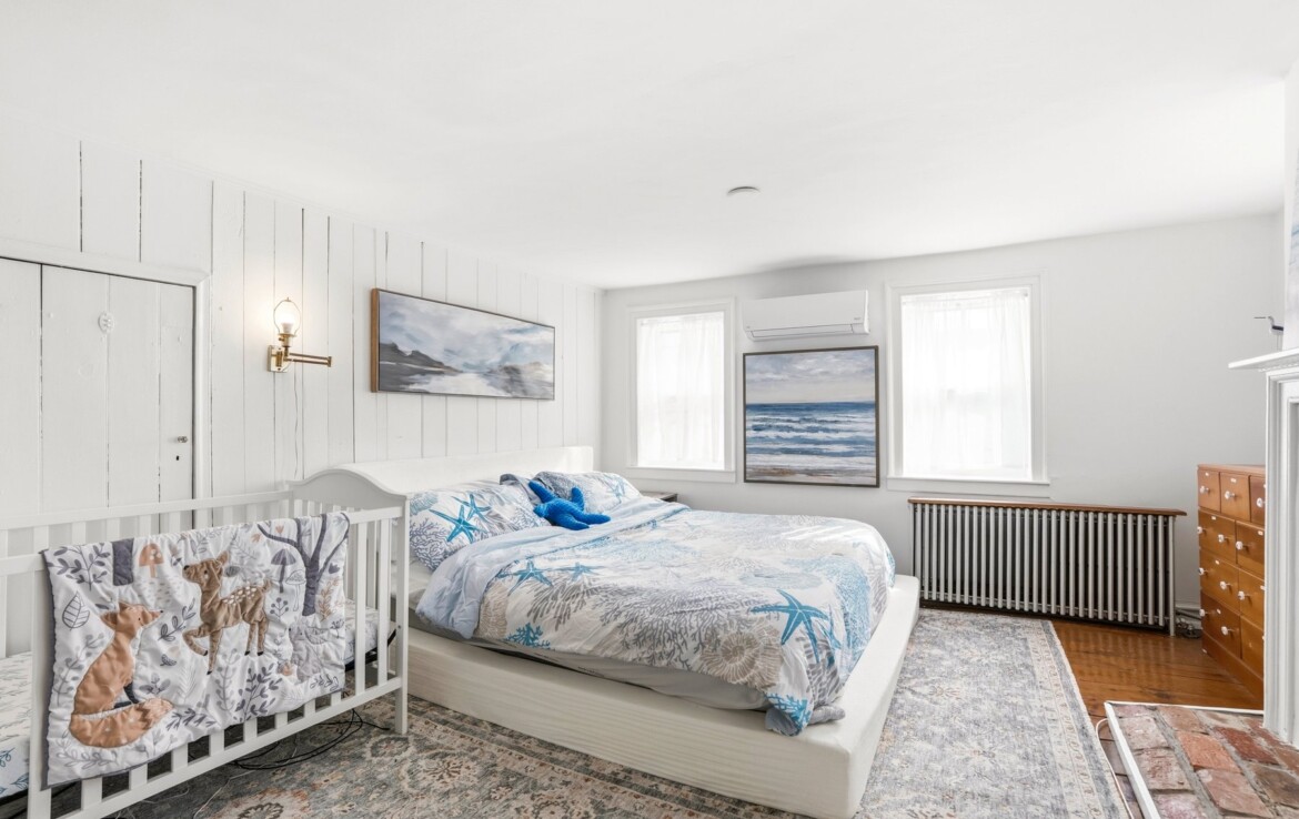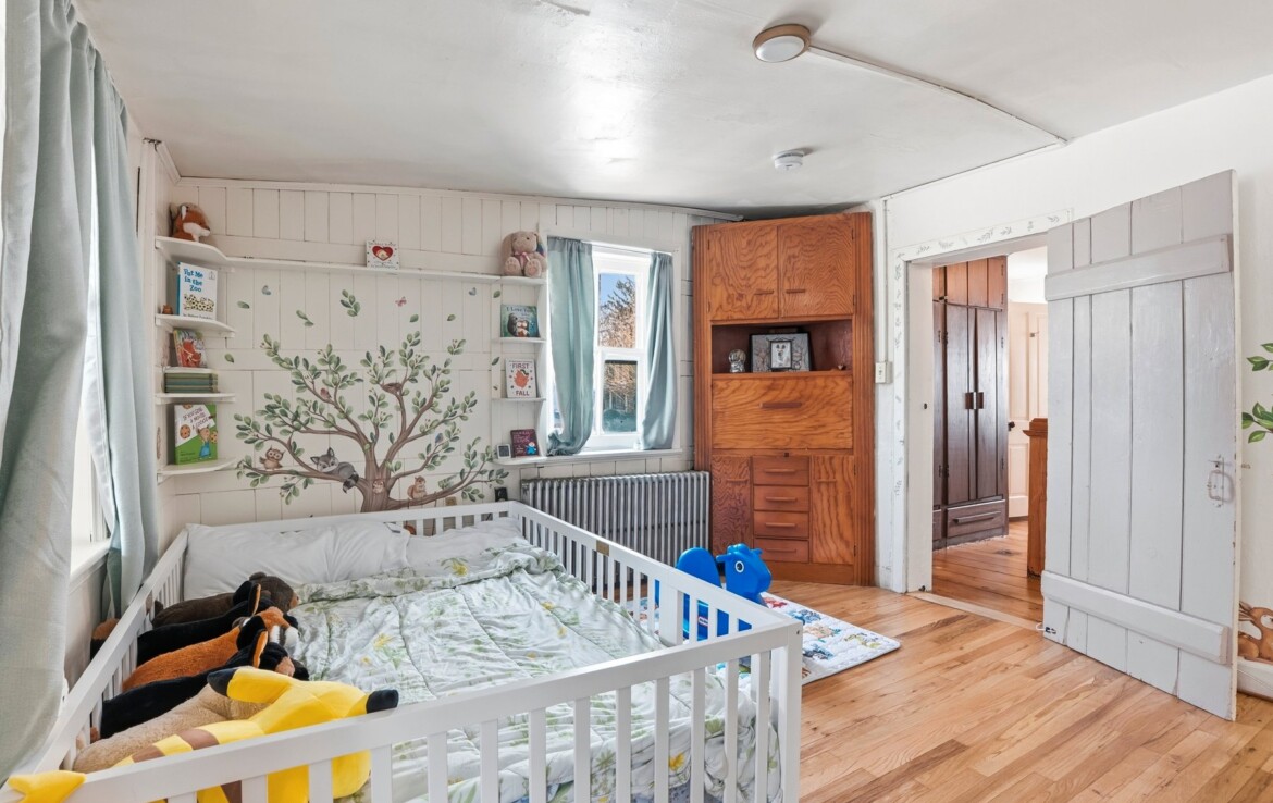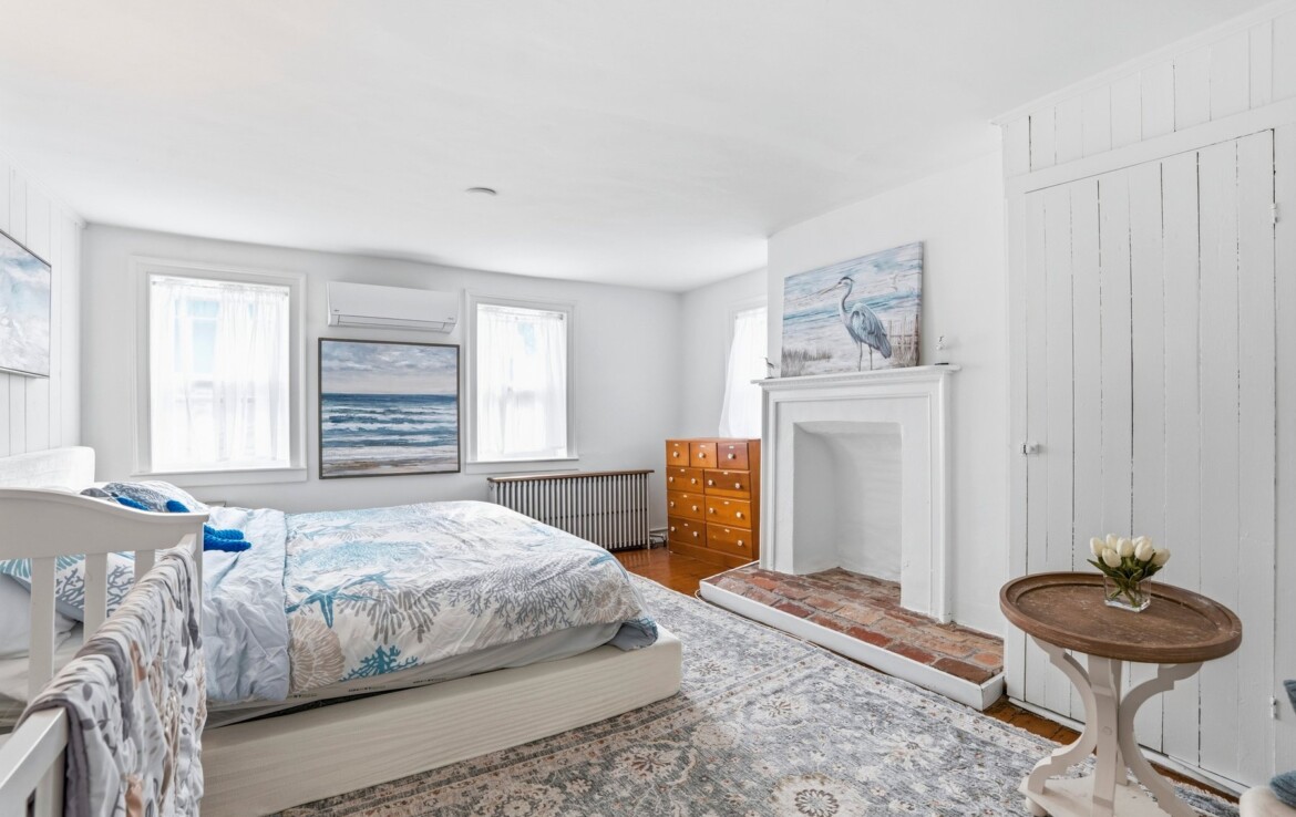 Bedroom 1  Wood floor, fireplace (sealed) with wood mantel, closet, door to walk-up attic, wood paneling, 3 windows.