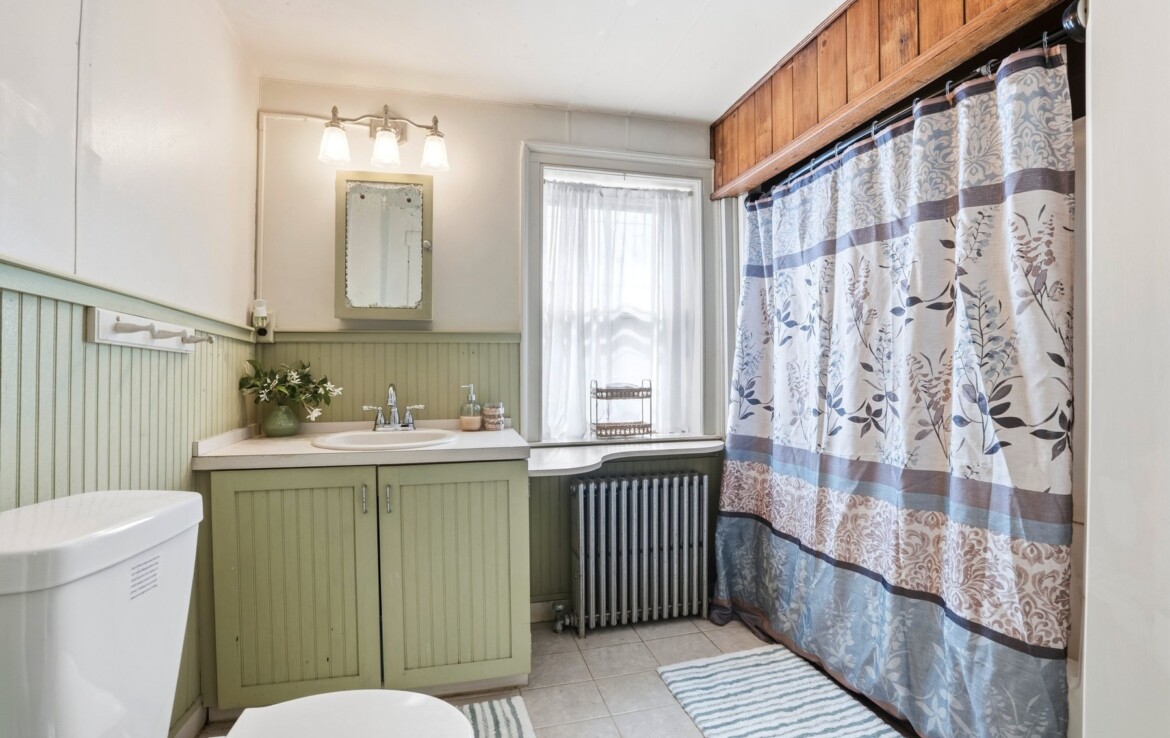 Hall Bathroom – Ceramic tile floor, bathtub, wainscot, 1 window.