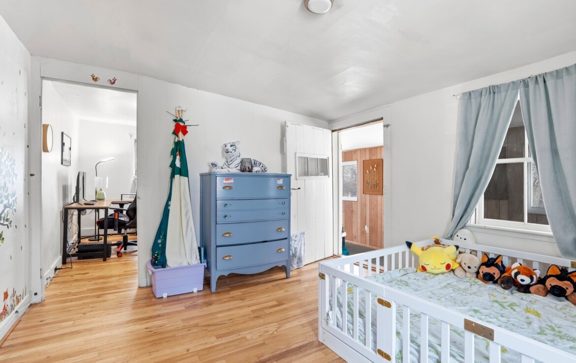 Bedroom 2 Wood floor, door to Bonus Room, wood paneling, 2 windows.