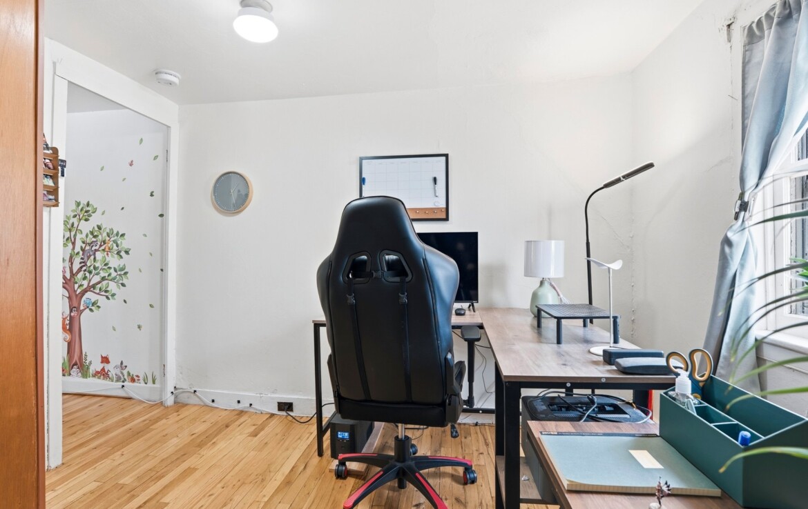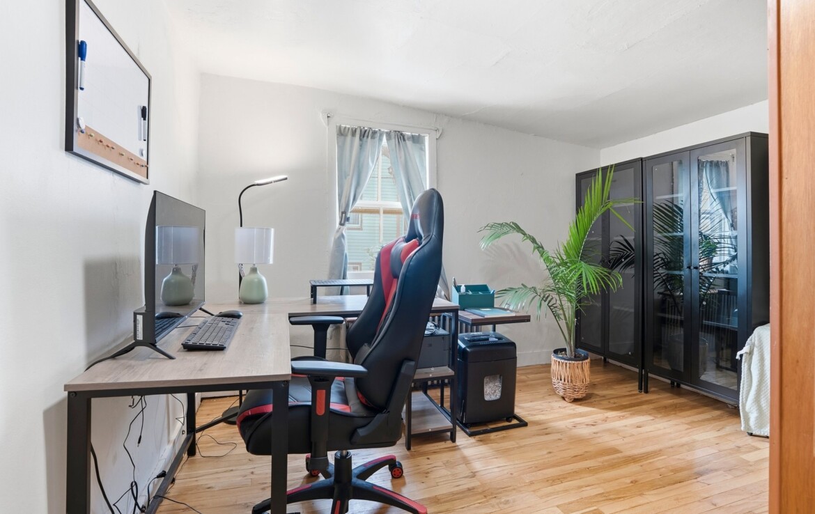 Study Wood floor, closet, Fujitsu mini split, 2 windows.